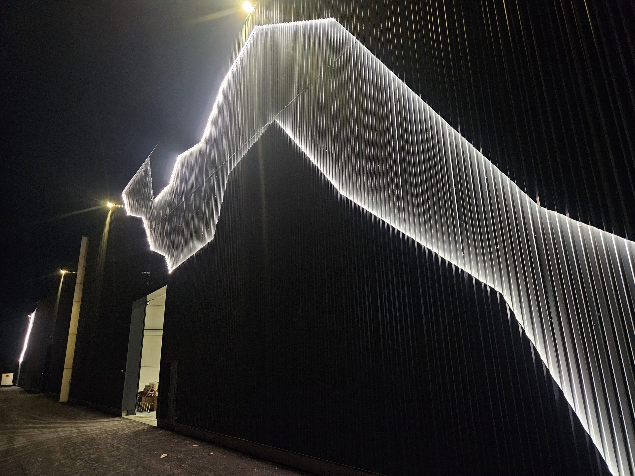 Nous venons d’achever une partie de la façade de notre projet de SAINT JULIEN DU SAULT pour SOPREMA, et les fameuses « failles » rétroéclairées qui donne la touche esthétique au bâtiment logistique.